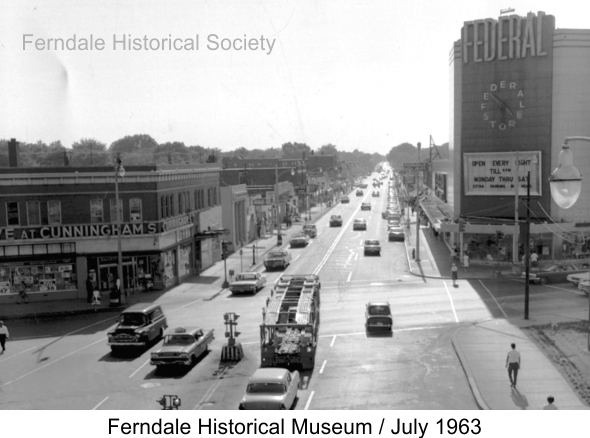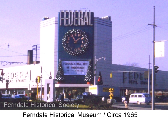 Ferndale's Northwest corner started out with a church and small wooden real estate office of George Badder. In 1920 Mr. Badder built the first brick two story office building in Ferndale. In 1924 the entire "Badder Building" was moved several feet west to prepare for Wider Woodward and 20 feet north for a wider Nine Mile Rd. The Badder Building housed MacMillan Drugs, Merchant's Restaurant, C. Archambeau supplies, a variety of other stores, and many offices above. On March 25, 1937, Federal's Department Store opened north of the Badder building and shared a wall with the Radio City Theatre. A new building was designed for Federals by Charles N. Agree very similar to other Federal's stores in the area. In 1949 the Badder building was demolished and the new Federal's store was built. Its grand opening was May 4, 1950 with prize drawings - including trips to Cuba! Its clock tower dominated the corner of Woodward and 9 Mile for three decades. In March 1973 Federal's closed their Ferndale store, along with 11 other local stores. Some likened it to Detroit losing its downtown Hudson store - which was unimaginable. Many people wanted a K-Mart in the Ferndale location. The store did briefly reopen as "Rags To Riches" by businessman Stefan Szbunia, but was short lived. The adjacent Radio City Theatre had become a Revco drug store which left in 1974 sparking debate about use of these 2 big empty buildings. One idea was to turn those and adjacent stores on Nine Mile into a mall featuring small merchants. An idea very close to the "Rust Belt" concept which opened 37 years later. Another plan was to convert Federal's corner into a multi-level parking structure. Due to ventilation requirements and project cost that idea failed (thankfully). Unfortunately, due to the fire of 1975, the Nine Mile stores were lost (but not Federal's) making the mall idea less feasible. Ultimately, in 1979 the Federal's store and Radio City Theatre were demolished. A new structure was built in 1984. Initially it was a "Gap Outlet" store then in 1994 an "Old Navy". In 2011 the Rust Belt market opened and continues to flourish.